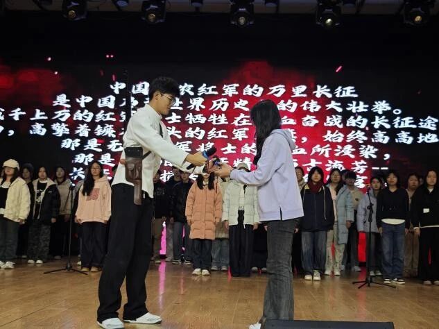 “昏睡百年,国人渐已醒!”《万里长城永不倒》的激昂旋律响彻排练场。全体同学齐声高歌,声浪如骏马奔腾,气势如虹;又如雏鹰振翅,清亮有力,尽显动科学子同心同向的磅礴气势。歌曲尾声,指挥挥臂劈开写有“东亚病夫”的纸条,象征打破屈辱枷锁;队伍迅速变换队形,将小提琴手围于中央,星光灯与红旗灯相映,悠扬琴声串联起过去与当下,既致敬先辈抗争,更彰显我辈斗志。