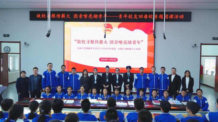 为深入推进青年思想引领,传承红色基因,传递青春正能量,我校青年讲师团团长、动物科技学院23级学生姜宇航带领青年讲师团代表重返母校吉林大学附属中学,为全校入团积极分子带来了一堂主题鲜明、内涵丰富的团课。本次活动以“故校寻根传薪火,团音嘹亮励青年”为主题,通过青年视角解读团员使命,以榜样力量点燃青春梦想,赢得了现场师生的热烈反响。